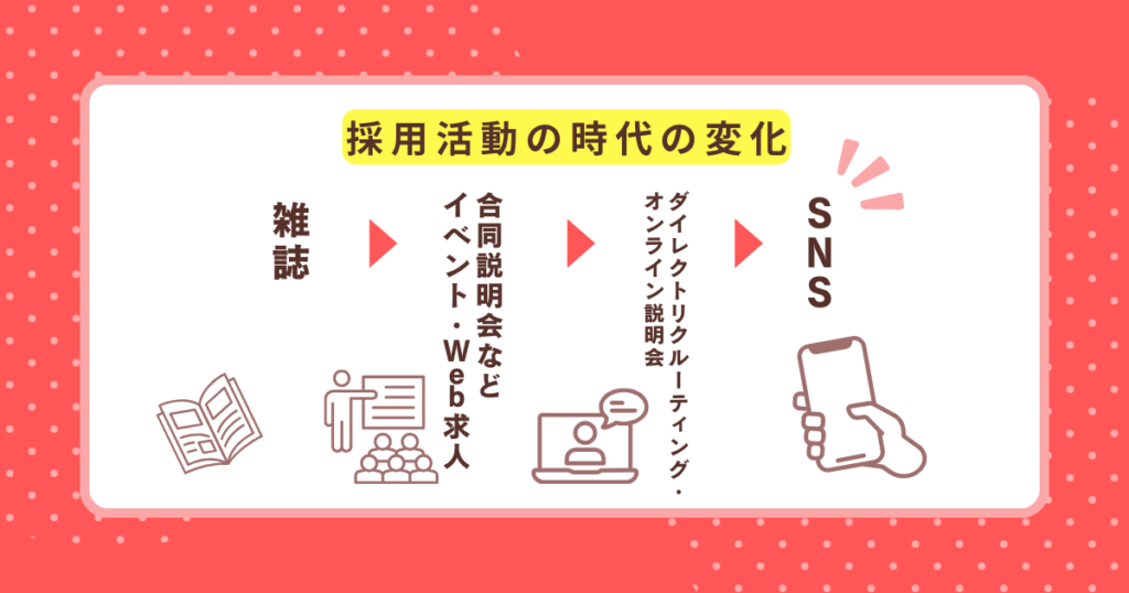 雑誌→合同説明会などイベント・Web求人→ダイレクトリクルーティング・オンライン説明会といったように。