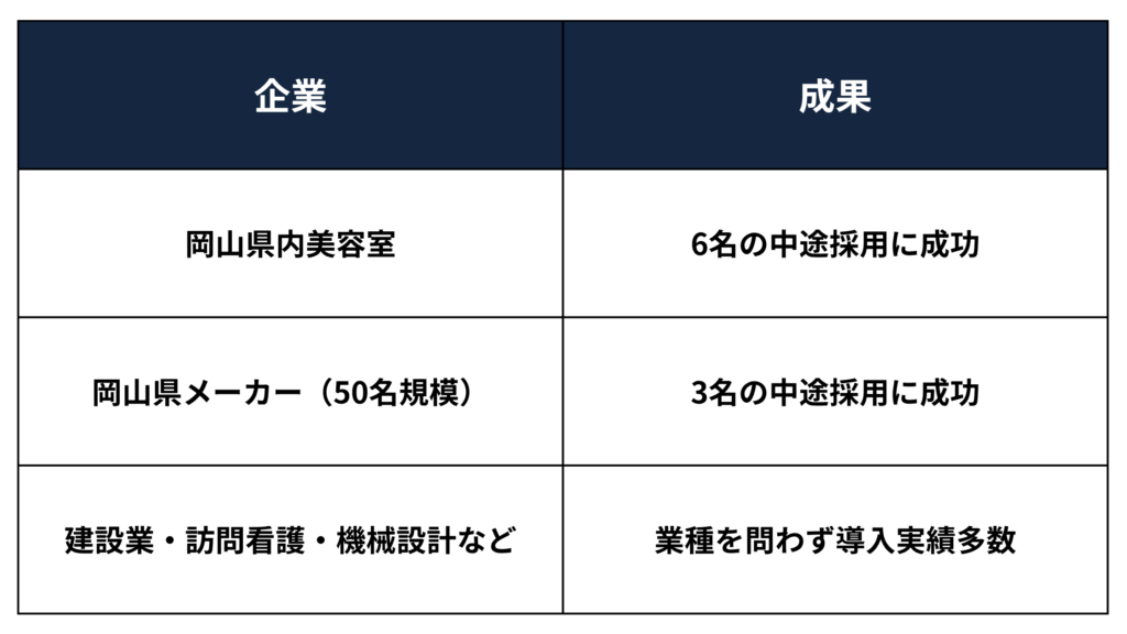 - 岡山県建設業・北海道自動車販売・兵庫訪問看護・岡山機械設計など、業種・規模を問わず導入実績多数
