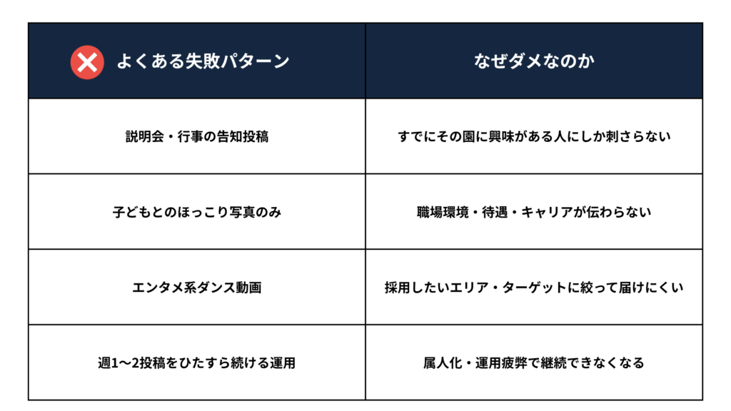 「アカウントは作ったのに成果が出ない」という保育園の多くは、以下のいずれかに当てはまっています。