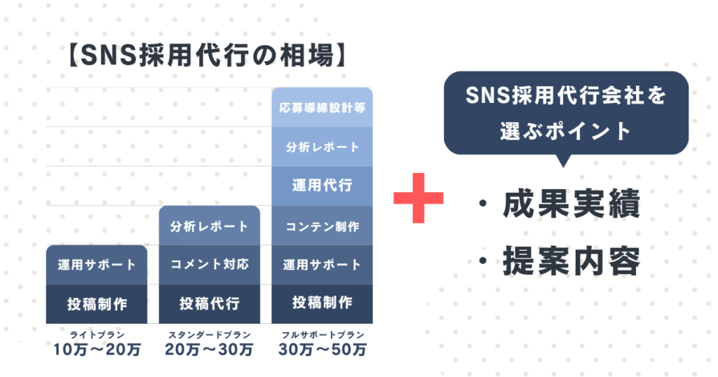 フルサポートプランでは、SNS運用、広告運用、動画制作、応募導線設計まで含まれ、月額30万円〜50万円程度が目安です。