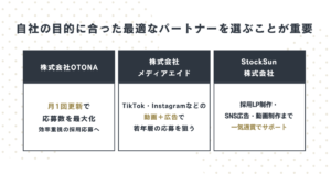 - 株式会社OTONA:少ない投稿数でもしっかり応募につなげる“LP型SNS採用”に特化。効率よく応募数を増やしたい企業に最適。