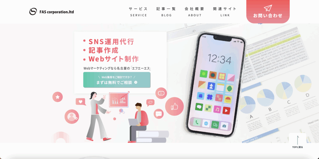 株式会社エフエーエスは、名古屋を拠点にSNS運用代行・Web制作・広告運用までを幅広く手がけるWebマーケティング会社です。InstagramやXの運用サポートはもちろん、採用サイトや企業HPの制作、広告運用、SEO対策、コンテンツ制作までワンストップで依頼できる点が大きな特徴です。