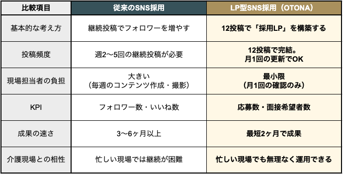株式会社OTONAが独自に開発した「LP型SNS採用」は、従来のSNS採用が抱えていた「継続運用の負担」を根本から解決する手法です。